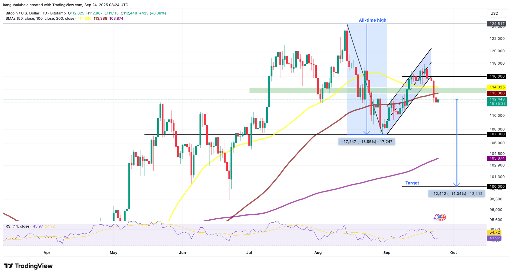 BTC Pazar günü 116.000 doların altına düşüyor, sonbahar trendinin devamını gösteren günlük grafikte (aşağıda) ayının ayısını doğruladı.