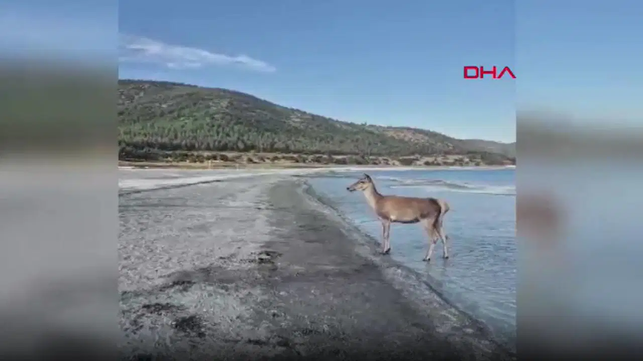 Bölgede popülasyonu takip edilen kızıl geyiklerden biri, Salda Gölü’ndeki halk plajının bulunduğu alana geldi. Halk plajını ziyaret edenlerin çok sevdiği geyik daha sonra oradan uzaklaştı.